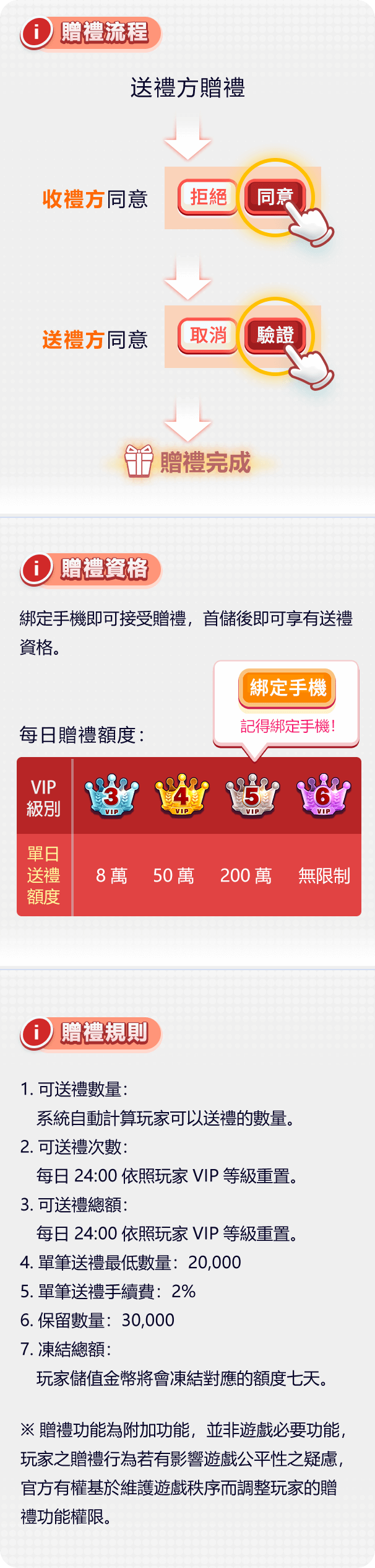 - 綁定門號升級為VIP2,開通接受贈禮的功能。