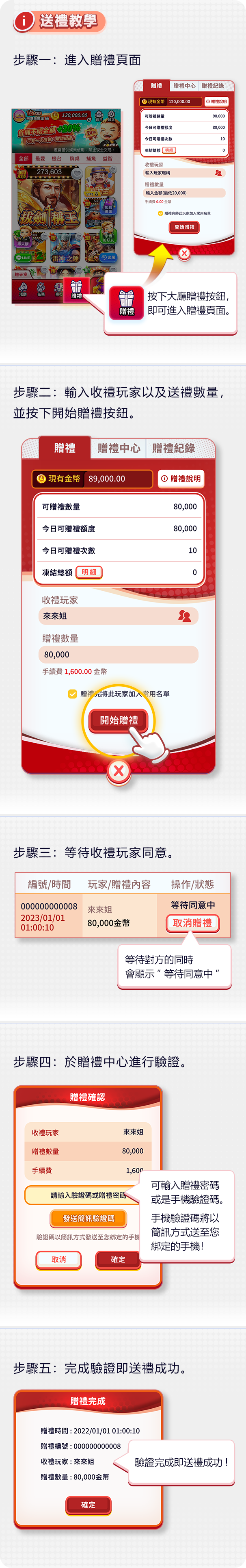 - 贈禮:此功能需要進行首次儲值及手機綁定才可開啟贈禮資格,詳細操作說明可點 擊【贈禮說明】,您可以將來博金幣送給其他好友